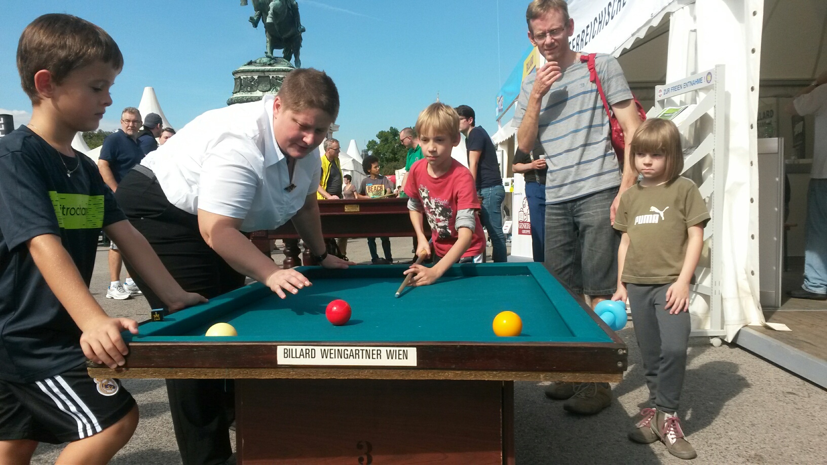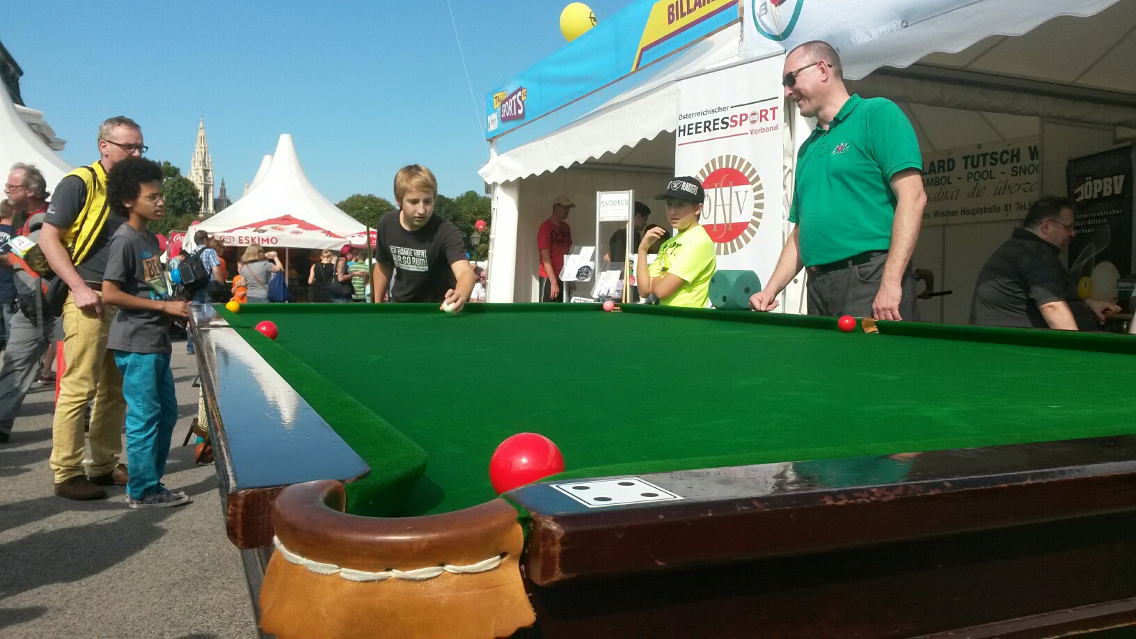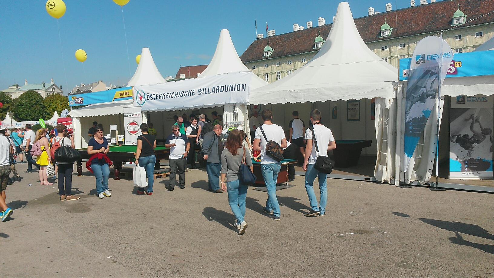 20.9.2014. Der Tag des Sports 2014 war für die Österreichische Billardunion (ÖBU) und damit auch für den BSVÖ einmal mehr eine hervorragende Gelegenheit, den Billardsport in die Öffentlichkeit zu tragen.