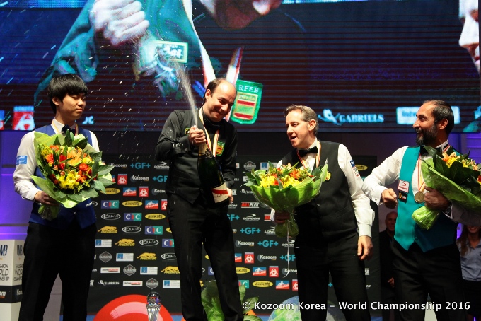 Die Sieger der Dreiband WM in Bordeaux v.l.n.r.: Kim Haeng Jik, Daniel Sanchez, Eddy Leppens, Semih Sayginer