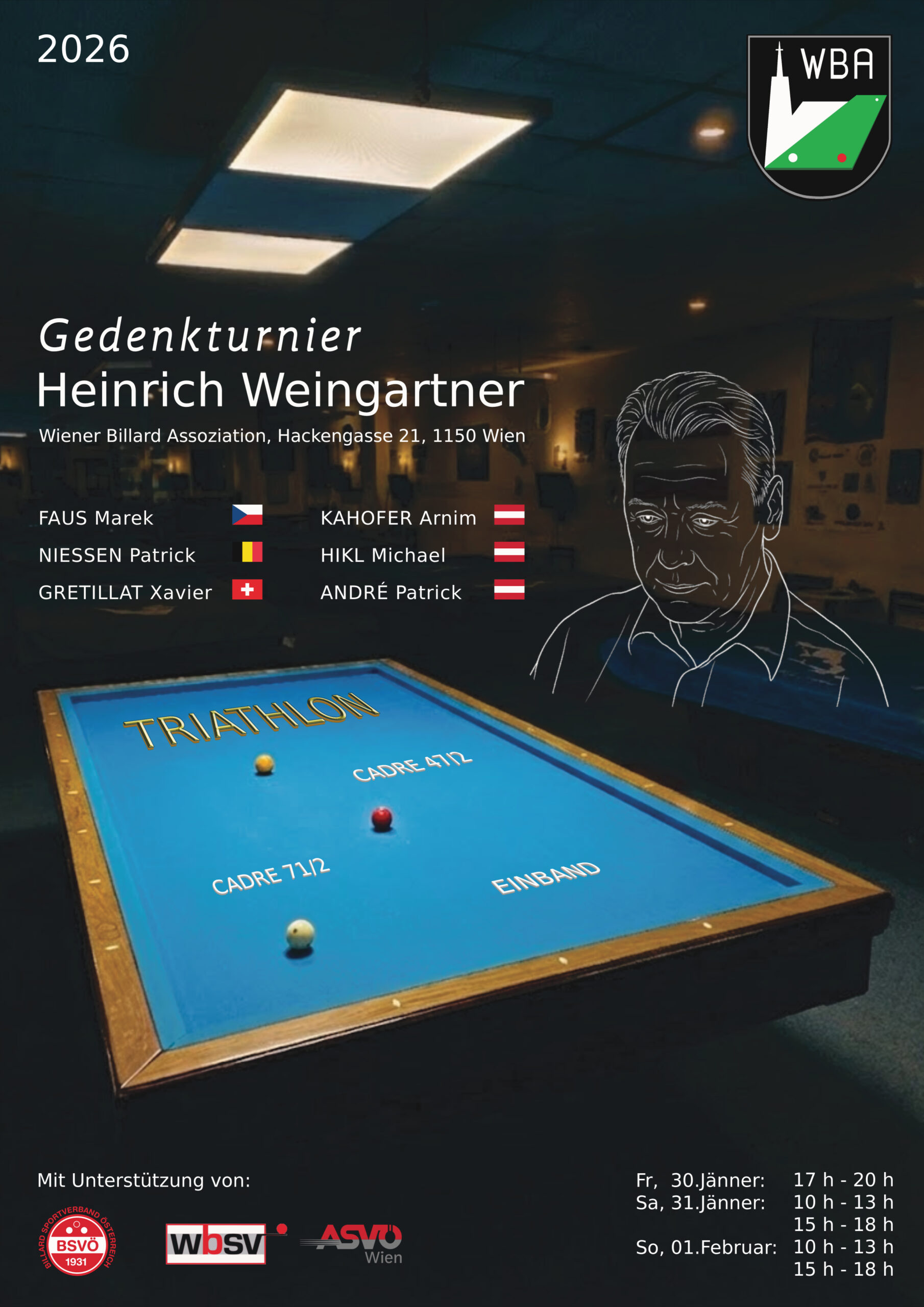 06.01.2026. In besonderer Erinnerung an einen unermüdlichen Wegbegleiter des nationalen und internationalen Carambol-Billardsports sowie dem Gründer der „Wiener Billard Assoziation“ (WBA) veranstaltet die WBA vom 30.01. – 01.02. 2026 das Heinrich Weingartner Gedenkturnier.
