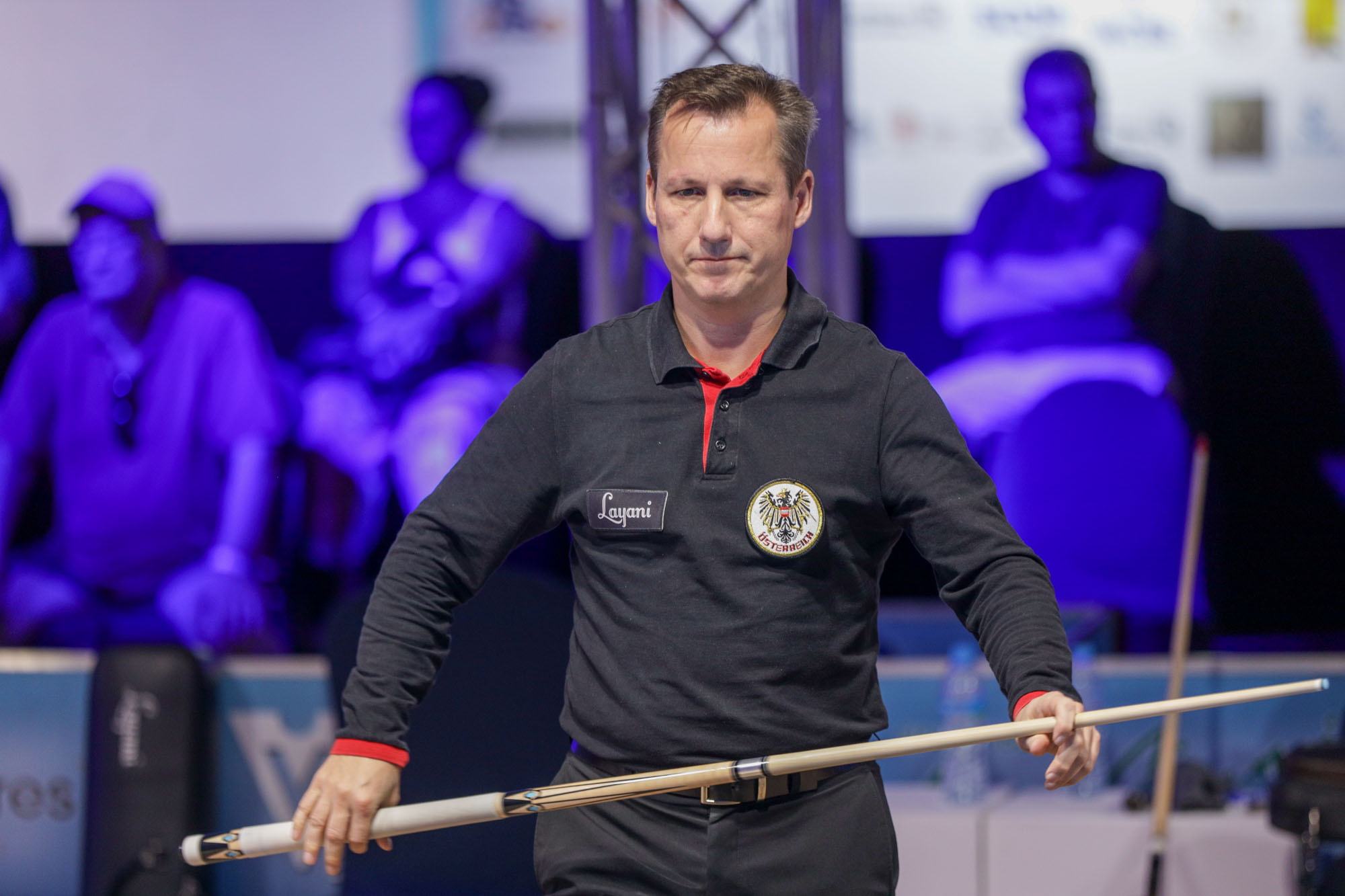 Der regierende Dreiband-Staatmeister, der am Dienstag im dritten von vier Qualifikationsdurchgängen in den Wettkampf einstieg, dort zu Beginn den Tschechen Radek Novák mit 35:25 in 23 Aufnahmen bezwang und anschließend den Japaner O Takeshima mit 35:23 mit der gleichen Anzahl an Aufnahmen abfertigte, unterlag gestern im Qualifikationsfinale dem Niederländer Jeffrey Jorissen klar mit 17:40 in 24 Aufnahmen. Der abschließende 40:39-Sieg des Wieners gegen den Belgier Roland Forthomme fiel nicht mehr ins Gewicht.